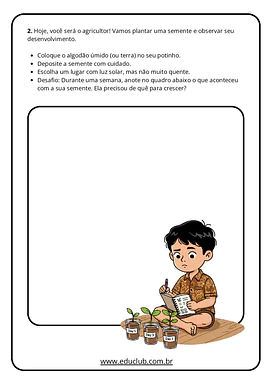 A Atividade sobre agricultura pode ser trabalhada de forma individual ou em pequenos grupos. O experimento de plantio pode ser acompanhado diariamente, incentivando a responsabilidade e o registro. A discussão sobre a origem dos alimentos e os tipos de plantio pode gerar debates ricos e interdisciplinares.