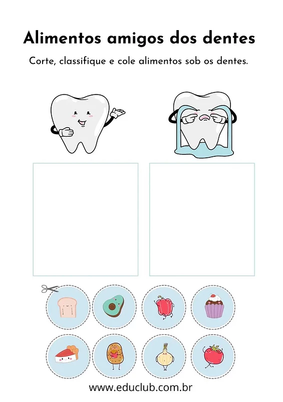 O objetivo é identificar os alimentos amigos dos dentes. O que comemos que é saudável e o que não? A criança deve recortar as imagens no fim da página e colar no quadro correto. O dente sorrindo indica que os alimentos que ingerimos são saudáveis. O dente chorando assinala que os alimentos são, em geral, processados e doces.