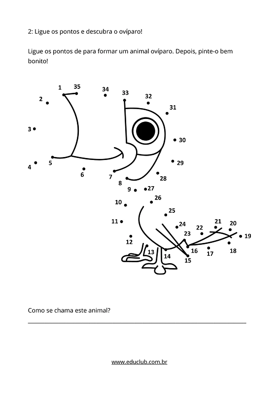 - Ligue os pontos: Um exercício clássico que desenvolve a coordenação motora e a concentração. Ao ligar os pontos, os alunos revelam um animal ovíparo surpresa e escrevem o nome dele.