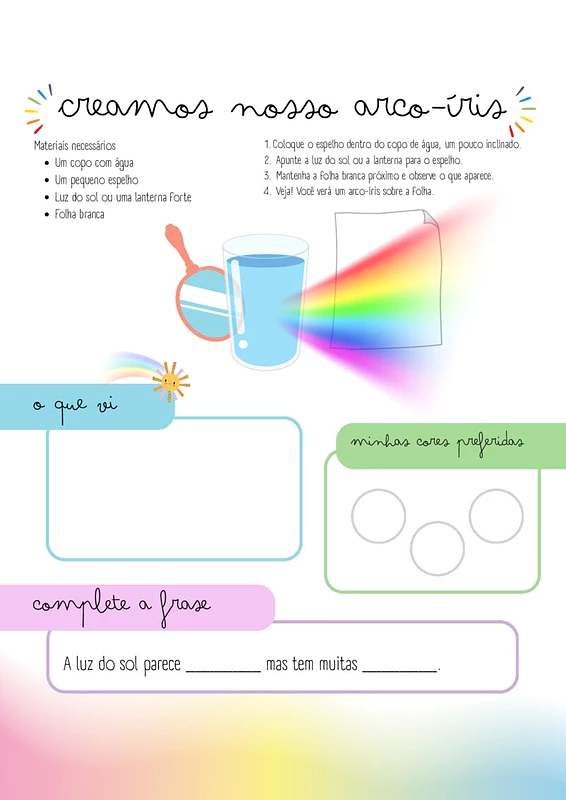 Nesta atividade, você encontrará um guia simples para criar um arco-íris utilizando materiais cotidianos como copo com água, espelho, luz do sol ou lanterna e folha branca. O material também inclui um espaço para registro do que foi observado e uma frase para completar, consolidando o aprendizado sobre a luz e suas cores.