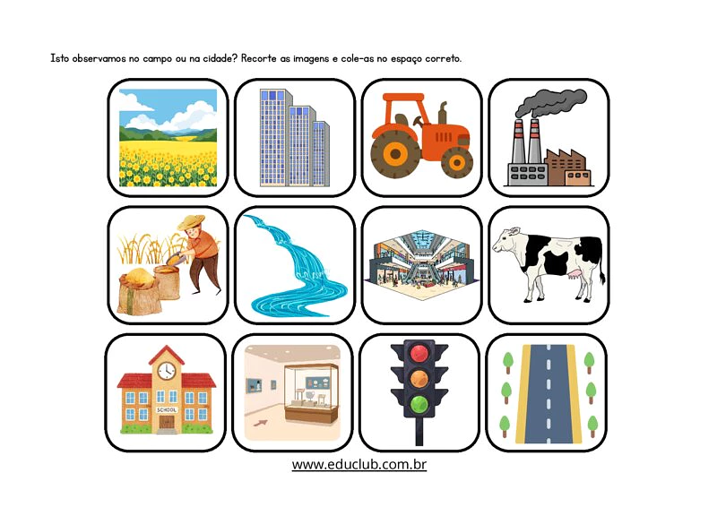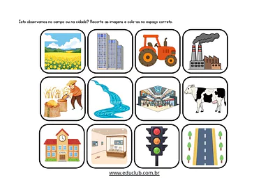 Neste material, você encontrará uma atividade prática onde os alunos deverão recortar imagens representativas do campo e da cidade e colá-las nos espaços corretos. A atividade inclui ilustrações claras e um layout intuitivo para facilitar a compreensão e a execução por parte das crianças.