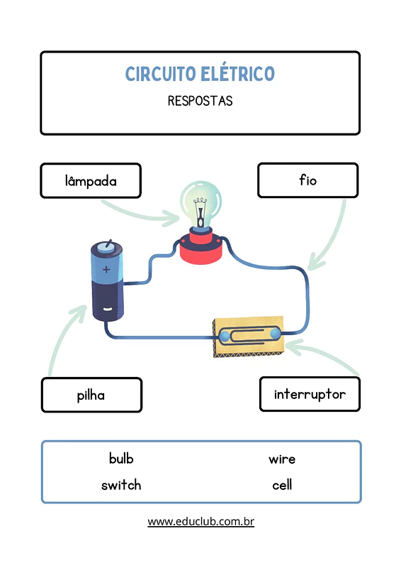Nesta atividade, você encontrará uma ilustração clara de um circuito elétrico, acompanhada de um banco de palavras com os nomes dos componentes (lâmpada, fio, interruptor, pilha). O material também inclui uma página com as respostas, facilitando a correção e o aprendizado autônomo ou em grupo.