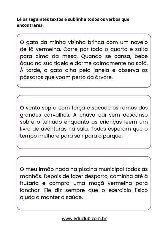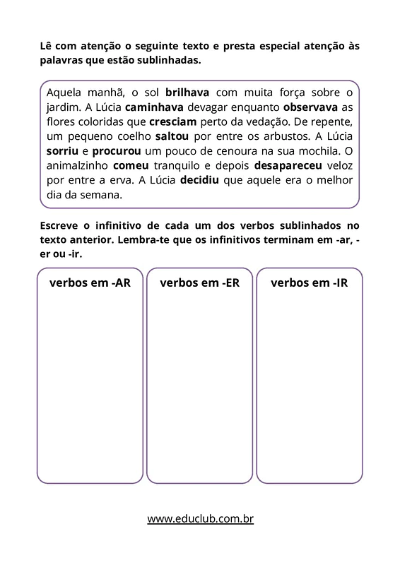 Nesta atividade sobre conjugação dos verbos, você encontrará textos curtos e interessantes onde os alunos deverão identificar verbos sublinhados e escrever seus infinitivos. Há também exercícios de leitura que pedem para sublinhar todos os verbos encontrados, abrangendo diferentes contextos e tempos verbais.