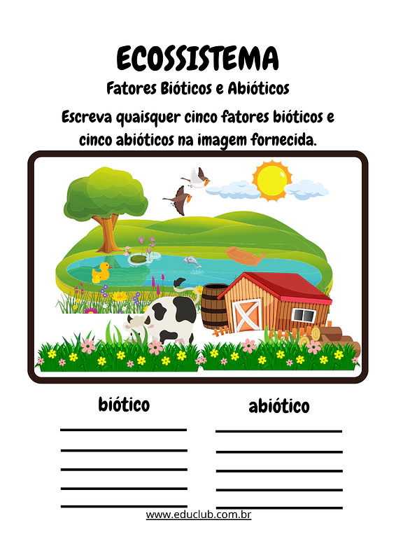 Compreender o que é um ecossistema e como seus componentes interagem é a base para a educação ambiental e o pensamento científico. Para introduzir esse tema fascinante, o Educlub.com.br preparou uma atividade clara e objetiva sobre os fatores bióticos e abióticos.