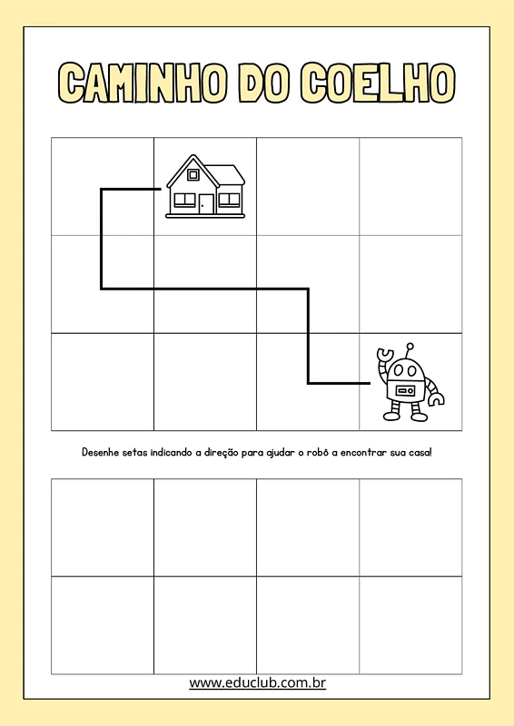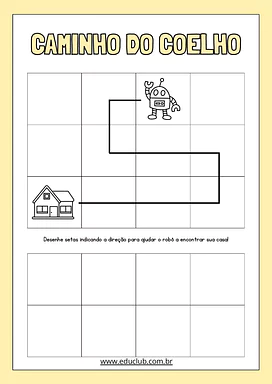 Nesta atividade, você encontrará folhas de atividades com o desafio de guiar um robô até sua casa, desenhando setas que indicam a direção correta. O material é repetido quatro vezes, permitindo prática e reforço do aprendizado.