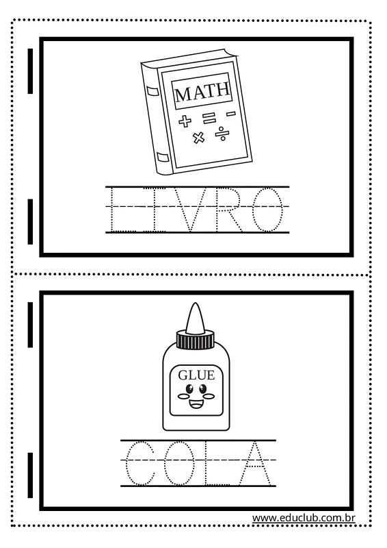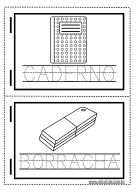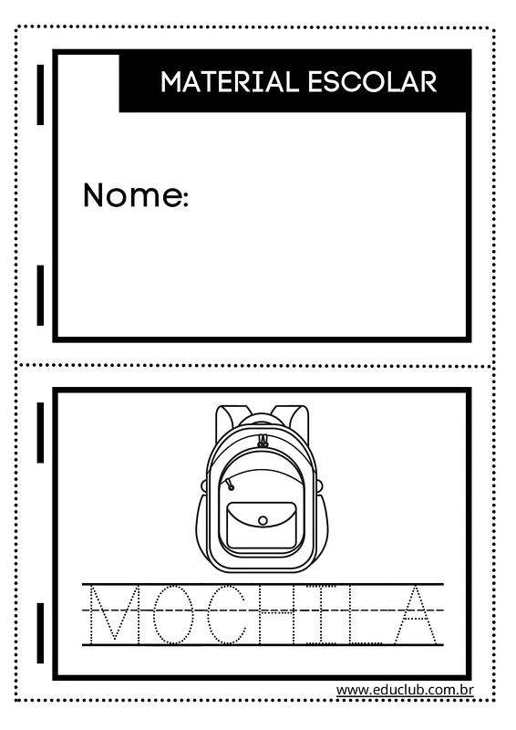 Nesta atividade, você encontrará ilustrações claras e simples de diversos materiais escolares, como mochila, caderno, borracha, livro, cola, giz de cera, lápis, apontador, tesoura e tinta. Cada imagem é acompanhada do nome do objeto, permitindo que as crianças associem a figura à palavra correspondente, e espaços para colorir.