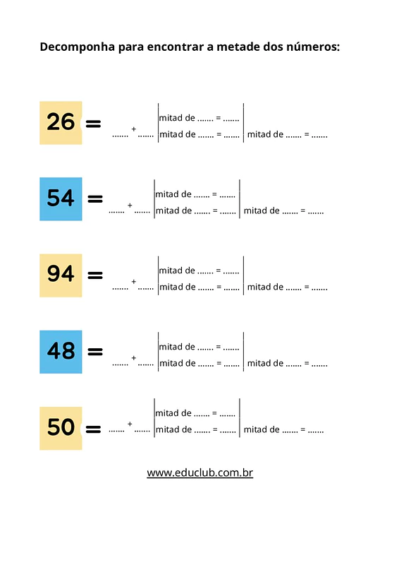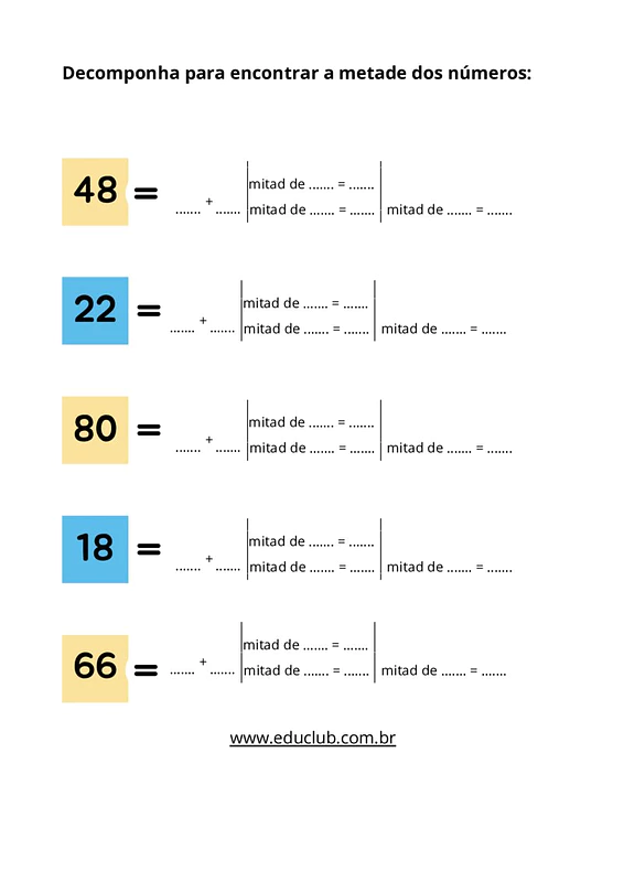 Nesta atividade sobre metade, você encontrará diversas folhas de exercícios com números variados, onde os alunos deverão decompor os valores para encontrar suas respectivas metades. O material apresenta uma estrutura clara e repetitiva que facilita a prática e a fixação do conteúdo.