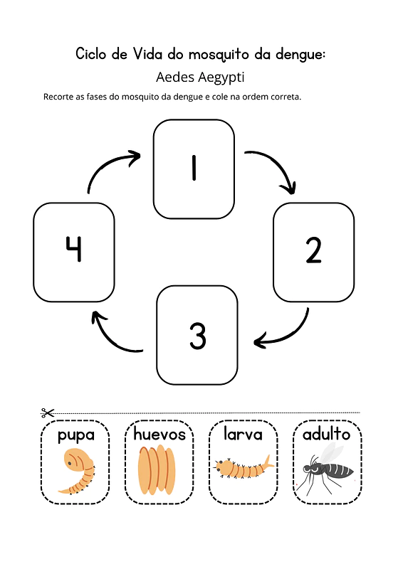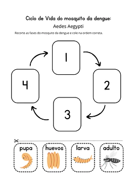 O nosso material contém uma atividade clara e objetiva sobre as quatro fases do ciclo de vida do mosquito da dengue. O material é projetado para que a criança possa visualizar e organizar o processo, e geralmente inclui: