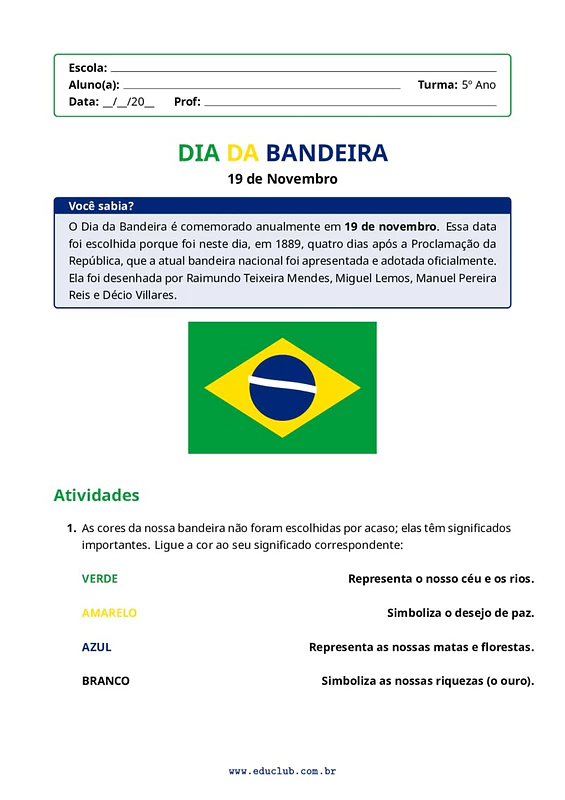 A atividade sobre o dia da bandeira para o 5º ano do ensino fundamental é um recurso didático envolvente que explora a história e os símbolos da bandeira nacional. Este material foi cuidadosamente elaborado para despertar o interesse dos alunos pela cultura e civismo brasileiros, promovendo uma aprendizagem significativa sobre um dos maiores símbolos do nosso país.