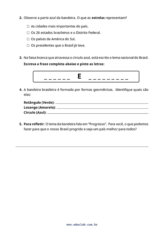 O principal objetivo da atividade é familiarizar os alunos com a história e os significados dos elementos da bandeira brasileira. Além disso, busca-se desenvolver o senso cívico e o pensamento crítico sobre o progresso do Brasil, incentivando a reflexão sobre o papel de cada cidadão na construção de um país melhor.