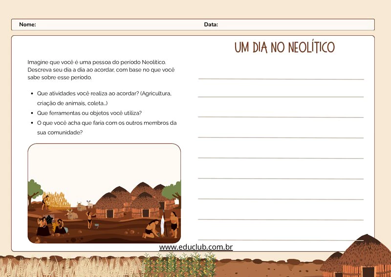 A atividade "Um Dia no Neolítico" é um recurso didático visual e textual projetado para alunos do Ensino Fundamental. Através da técnica de "história imaginada", os estudantes são transportados para uma aldeia pré-histórica, onde devem assumir o papel de um habitante da época e relatar seu cotidiano. Esta abordagem ajuda a humanizar o estudo da História, transformando fatos datados em experiências vivas e compreensíveis.