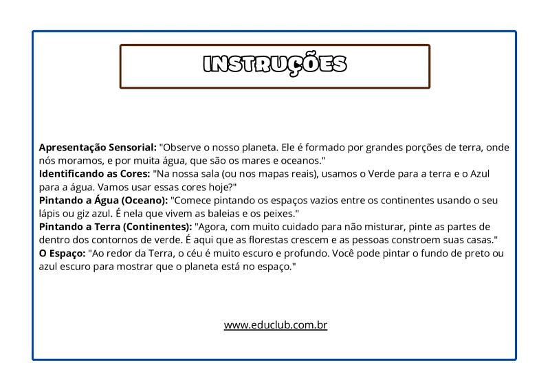 Nesta atividade sobre o nosso planeta para colorir, você encontrará um desenho esquemático do Planeta Terra pronto para ser colorido, acompanhado de instruções detalhadas para guiar a pintura. As instruções sugerem o uso de cores específicas (verde para a terra e azul para a água) e a pintura do espaço ao redor do planeta.