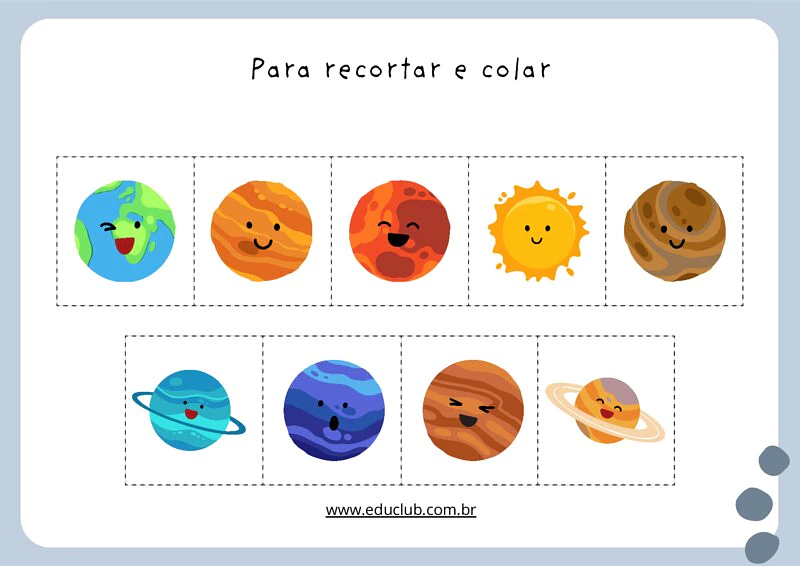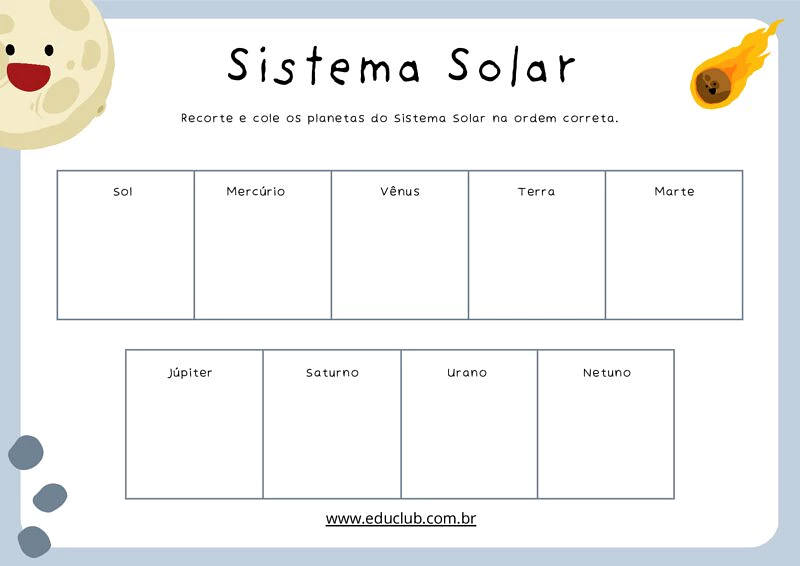 O principal objetivo da atividade sobre o nossos sistema solar é apresentar os planetas do Sistema Solar de maneira acessível e envolvente. Busca também estimular a coordenação motora fina através do recorte e colagem, além de promover o reconhecimento da sequência dos planetas em relação ao Sol.