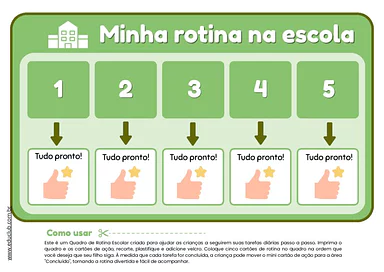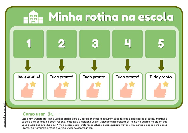 Em sala de aula, a atividade pode ser utilizada individualmente ou em pequenos grupos, permitindo que cada aluno organize sua própria sequência de tarefas. O professor pode guiar a montagem do quadro e dos cartões, incentivando a discussão sobre a importância de cada atividade e a sensação de dever cumprido ao mover os cartões para a área de "Concluído".