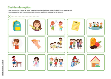 Você encontrará um quadro de rotina e diversos cartões de ação que representam as atividades diárias na escola. O material inclui instruções detalhadas sobre como montar e utilizar o recurso, sugerindo o uso de recorte, plastificação e velcro para maior durabilidade e interatividade. Os cartões de ação são variados, permitindo a personalização da rotina de cada criança.