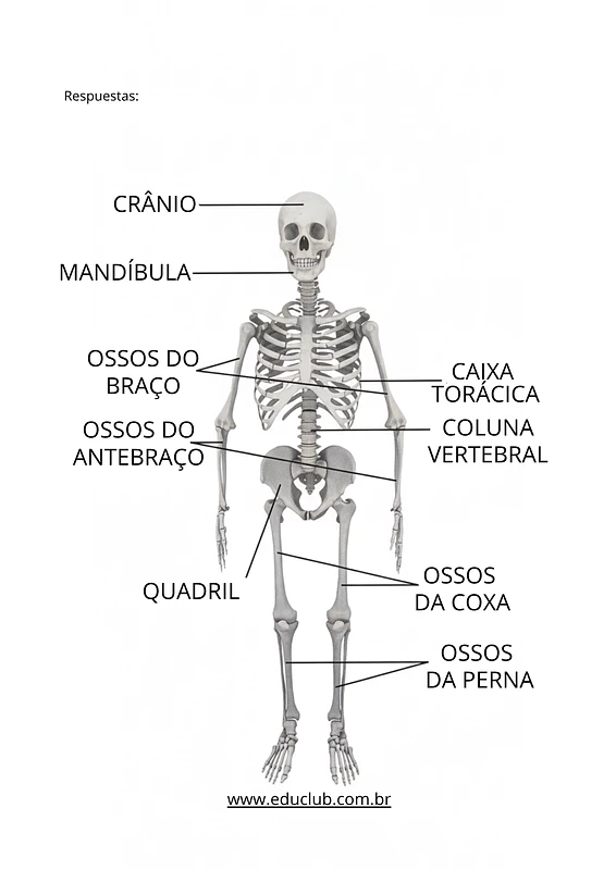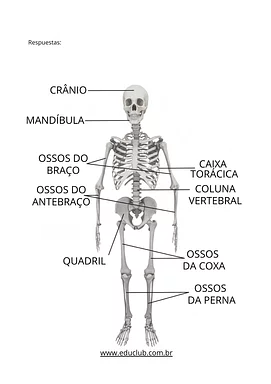 Este material tem como objetivo desenvolver o conhecimento dos alunos sobre o sistema esquelético, permitindo que identifiquem e nomeiem corretamente os principais ossos do corpo humano. A atividade promove a associação entre a localização anatômica e a nomenclatura científica dos ossos, fortalecendo a aprendizagem através da prática de completar e rotular.
