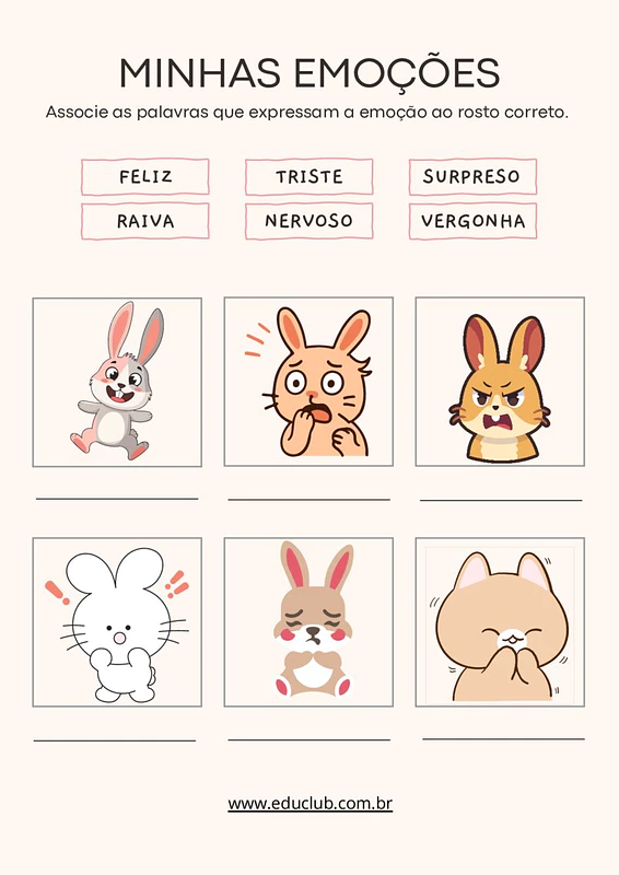 - Distribua os cartões com as palavras das emoções e os rostos ilustrativos. As crianças devem trabalhar em grupos ou individualmente para associar cada palavra ao rosto que melhor representa a emoção. Isso pode ser feito em um quadro ou em folhas de papel.