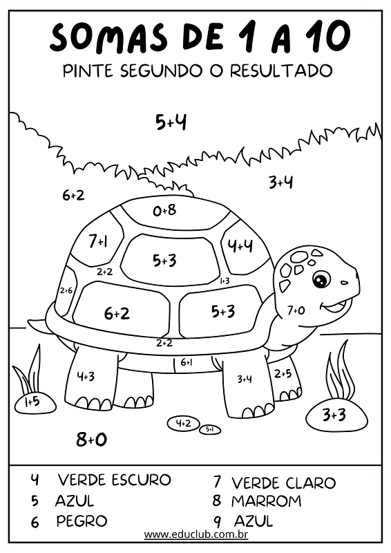 O objetivo principal desta atividade é reforçar a construção dos fatos básicos da adição, permitindo que os alunos pratiquem o cálculo mental de somas com resultados até 10. O material consiste em uma folha com diversas operações de adição espalhadas por um desenho. O aluno deve resolver cada conta e, de acordo com o resultado obtido, colorir a área correspondente com a cor indicada na legenda. Ao final, um desenho divertido é revelado, o que serve como um grande incentivo para a conclusão da tarefa.