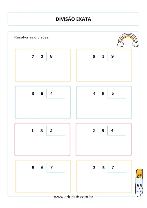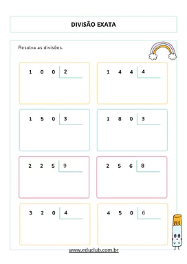 Neste material, você encontrará diversas páginas de exercícios focados exclusivamente em divisões exatas. Cada página apresenta uma série de problemas de divisão com diferentes níveis de complexidade, permitindo que os alunos pratiquem e dominem essa operação fundamental da matemática.