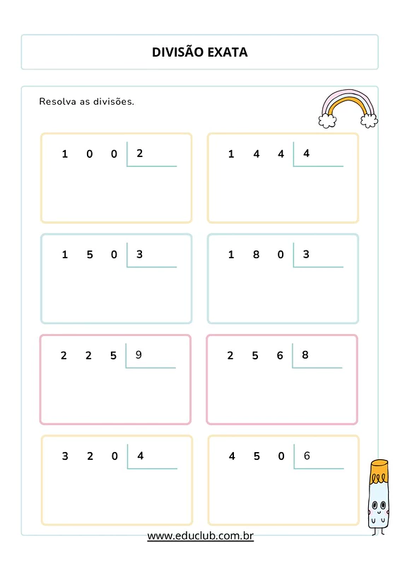 Explore o universo da divisão com as atividades com divisão exata para 4º e 5º ano, um recurso didático completo para aprimorar as habilidades de cálculo dos estudantes. Este material foi cuidadosamente elaborado para oferecer prática intensiva e consolidar o aprendizado sobre divisões exatas, essencial para o desenvolvimento matemático.