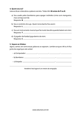 Neste material, você encontrará cinco atividades diversificadas e envolventes: 'O Detetive do M' para identificar palavras, exercícios de completar com M ou N, 'Mágica das Palavras' para formar novas palavras, 'Quem sou eu?' com adivinhas ortográficas e 'Separe as Sílabas' para praticar a divisão silábica. As Atividades M antes de P ou B são ideais para reforçar o aprendizado de forma lúdica e interativa.