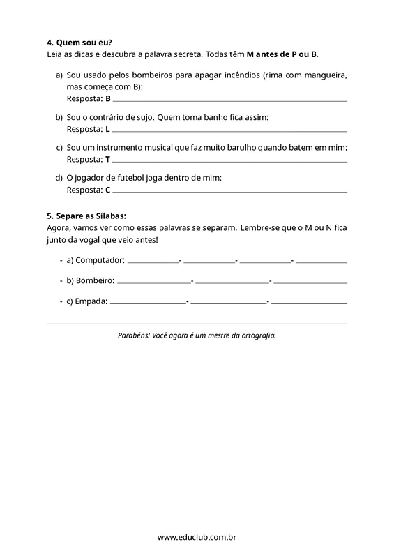 As atividades com M antes de P ou B são um recurso didático essencial para consolidar a regra ortográfica do uso de M antes de P e B e N antes das demais consoantes. Este material foi cuidadosamente elaborado para tornar o aprendizado da ortografia divertido e eficaz, ajudando os alunos a dominar uma das regras mais importantes da língua portuguesa.