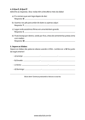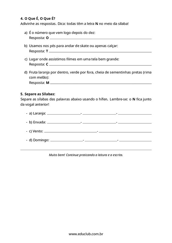 Explore o fascinante universo das sílabas com as Atividades com palavras terminadas em AN EN IN ON UN, um material didático envolvente e eficaz para o desenvolvimento da consciência fonológica. Este recurso foi planejado para auxiliar os alunos na identificação e uso correto dos sons nasais representados por AN, EN, IN, ON e UN, fundamentais para a leitura e escrita fluente.