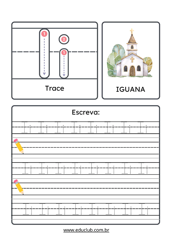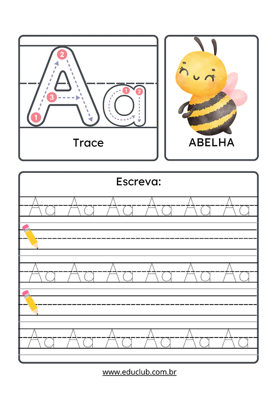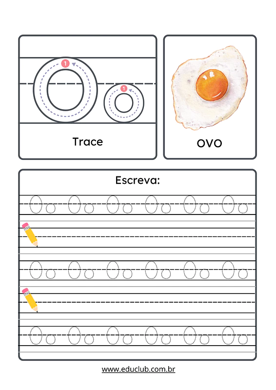 - Prática de escrita: Um espaço com linhas pautadas é dedicado para que a criança pratique a escrita livre da vogal, consolidando o que aprendeu no traçado.