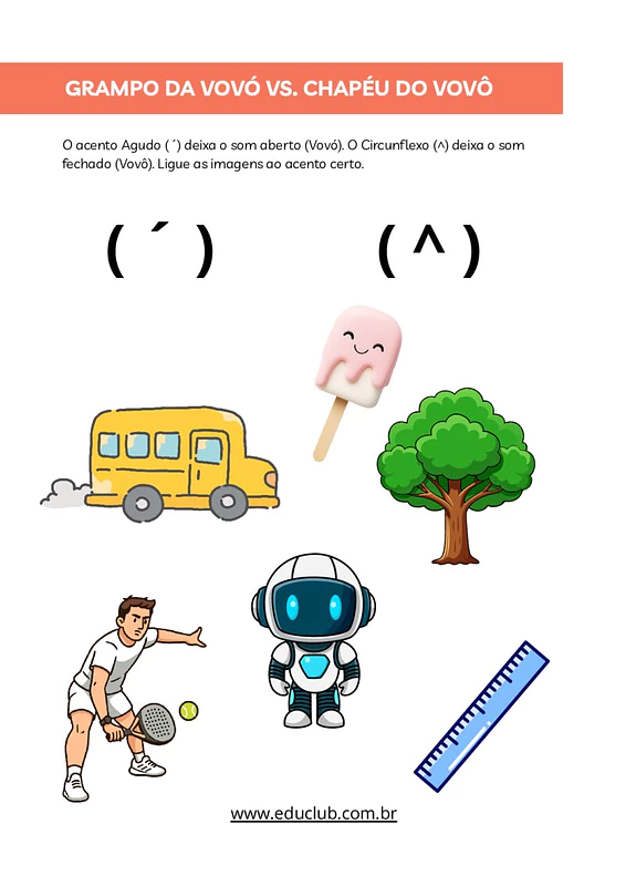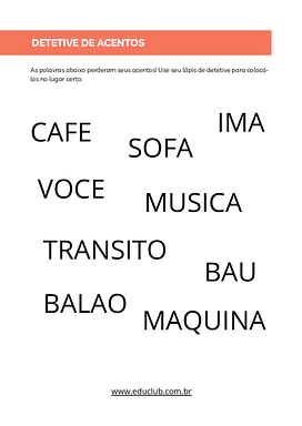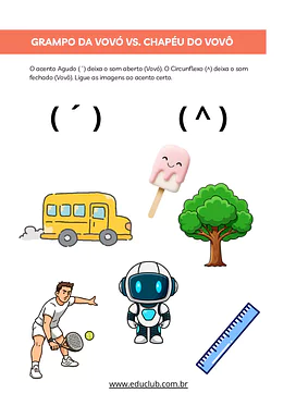 Neste material, você encontrará diversas atividades práticas, como a identificação do som nasal com o til, a diferenciação entre o acento agudo e circunflexo através de figuras, um exercício de detetive para acentuar palavras e um autoditado ilustrado. Há também uma proposta de recorte e classificação de palavras acentuadas para fixação do conteúdo.