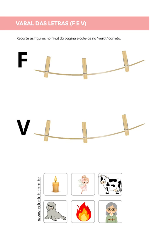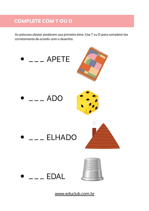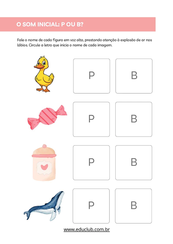 Neste material, você encontrará diversas atividades interativas, como exercícios de identificação do som inicial (P ou B), completude de palavras com T ou D, um varal das letras (F e V) para recorte e colagem, atividades de pares mínimos (troca-tudo) e um autoditado de bolso. Há também uma seção para encontrar o som oculto da letra D em diferentes posições da palavra.