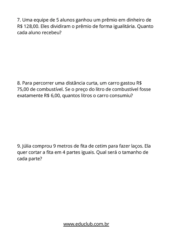 Neste material, você encontrará 9 problemas de divisão com números decimais, apresentados em cenários práticos e relevantes para o dia a dia dos alunos. Cada questão propõe um desafio diferente, envolvendo situações como divisão de dinheiro, líquidos, medidas de comprimento e peso, e cálculo de preço unitário.
