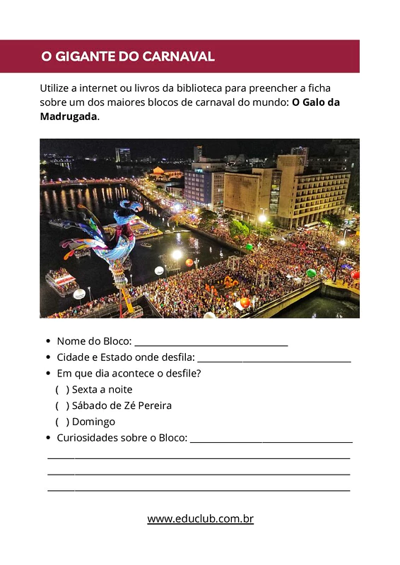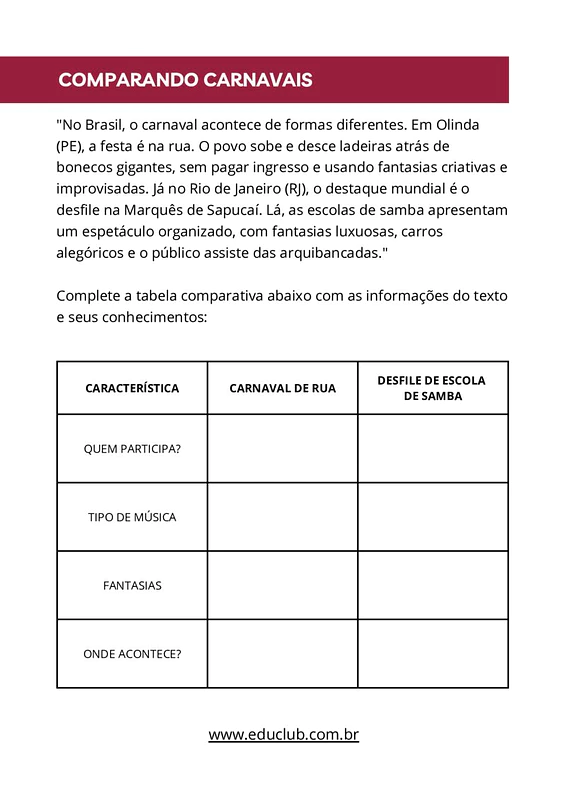 Você encontrará atividades que exploram os ritmos carnavalescos do Brasil, com um mapa para colorir e identificar estados. Há também uma tabela comparativa entre o Carnaval de rua e os desfiles de escola de samba, uma ficha de pesquisa sobre o bloco Galo da Madrugada e um texto com questões sobre o impacto econômico do Carnaval.