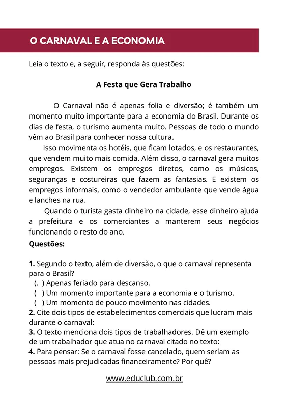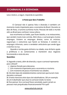 O material visa desenvolver a compreensão dos alunos sobre as diferentes manifestações do Carnaval no Brasil, suas características regionais e o impacto socioeconômico da festa. Além disso, busca aprimorar habilidades de leitura, interpretação de texto e pesquisa, conectando o conteúdo a aspectos geográficos e históricos do país.