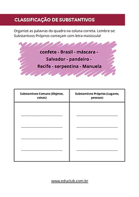 Neste recurso, você encontrará atividades diversificadas, como a identificação de adjetivos para fantasias carnavalescas, a classificação de substantivos relacionados ao Carnaval, uma produção textual criativa a partir de uma tirinha muda e exercícios de ortografia focados na regra do 'M antes de P e B'.