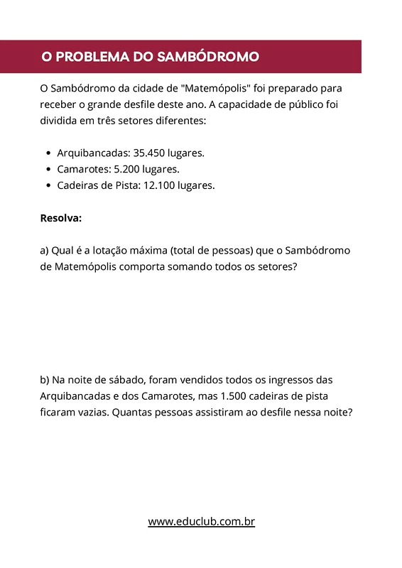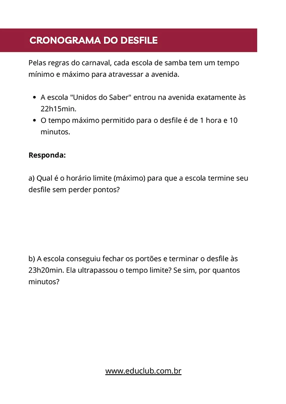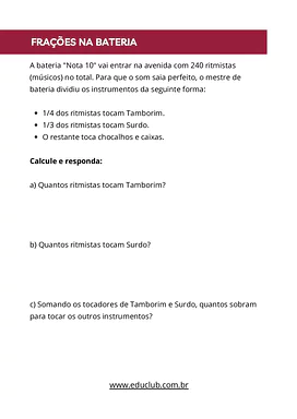 Neste material, você encontrará quatro atividades temáticas de Carnaval: 'O Problema do Sambódromo' (adição e subtração), 'Frações na Bateria' (cálculo de frações), 'Cronograma do Desfile' (cálculo de tempo) e 'A Média das Notas' (média aritmética). Cada atividade apresenta um problema contextualizado com o universo carnavalesco, acompanhado de questões para os alunos resolverem.