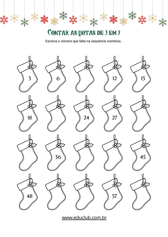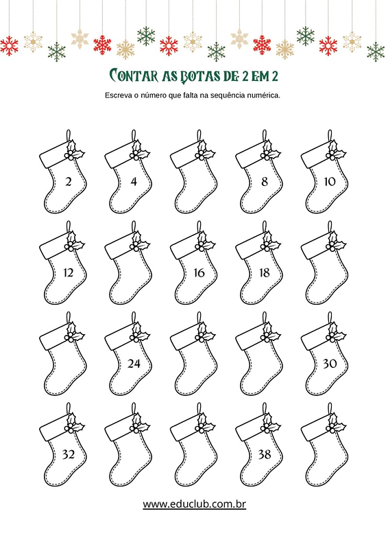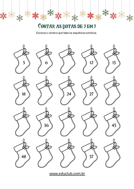 Este recurso educacional oferece uma série de atividades focadas em sequências numéricas de 2 em 2, 3 em 3, 4 em 4, 5 em 5, 6 em 6, 7 em 7, 8 em 8 e 9 em 9. Cada página apresenta um tema natalino com botas para preencher os números que faltam, tornando o exercício mais interativo e visualmente atraente.