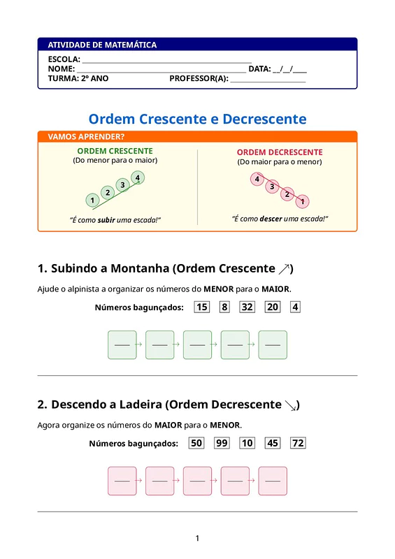 Explore o conceito fundamental de ordem numérica com as atividades de ordem crescente e decrescente para imprimir. Este material didático foi cuidadosamente elaborado para auxiliar os alunos do ensino fundamental a compreenderem e aplicarem a sequência numérica de forma divertida e interativa.