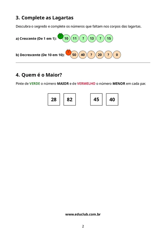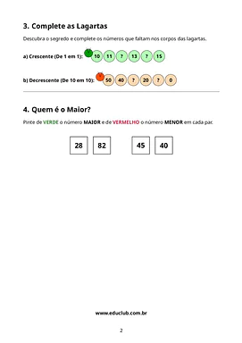 Neste material, você encontrará atividades práticas que abordam a ordem crescente e decrescente de forma lúdica. Inclui exercícios como 'Subindo a Montanha' e 'Descendo a Ladeira', onde os alunos organizam sequências numéricas, além de desafios para completar lagartas com padrões numéricos e identificar o maior e o menor número em pares.