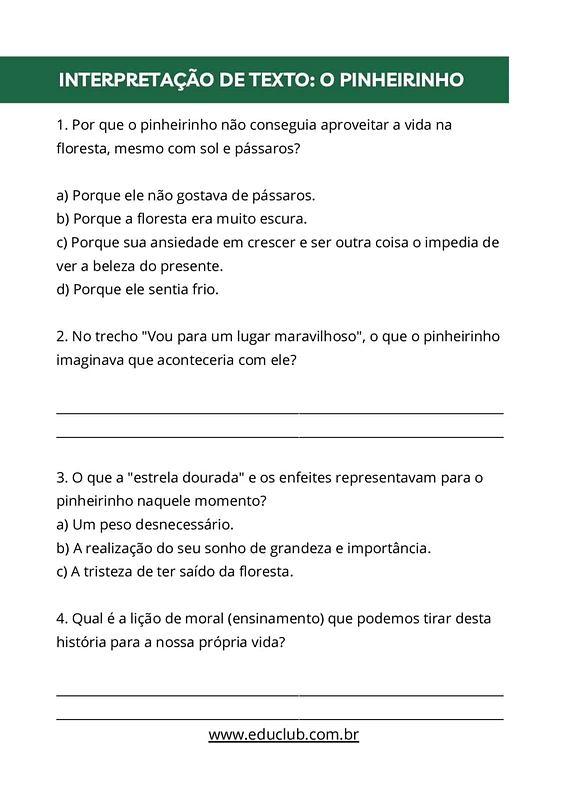Sugere-se iniciar com a leitura coletiva ou individual do conto 'O Pinheirinho', seguida de discussão para garantir a compreensão. As questões de interpretação podem ser respondidas em duplas ou individualmente, com posterior correção coletiva. Para a produção textual, incentive a criatividade e o uso adequado dos conectivos, promovendo a leitura dos novos finais criados pelos alunos.