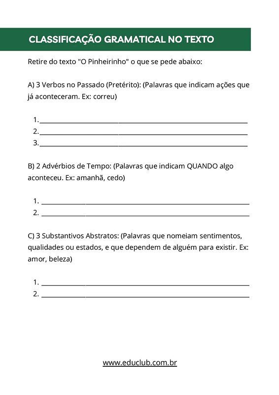 Este material inclui o conto adaptado de H.C. Andersen, 'O Pinheirinho', seguido de questões de interpretação de texto que exploram a compreensão e a moral da história. Há também exercícios de classificação gramatical, focando em verbos no passado, advérbios de tempo e substantivos abstratos, e uma proposta de produção textual para reescrita criativa do final do conto, com o uso de conectivos.