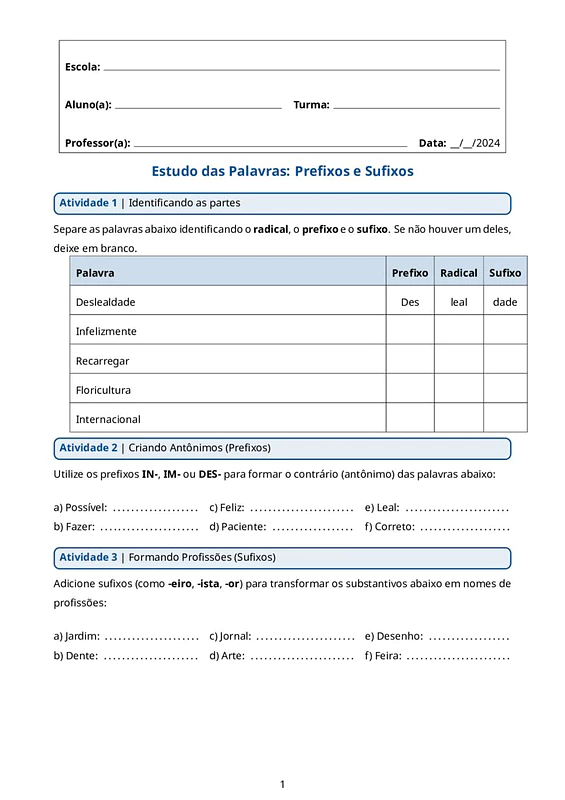 Os exercícios de prefixo e sufixo podem ser utilizadas como complemento às aulas de português, para reforço do conteúdo ou como avaliação diagnóstica. Sugere-se iniciar com uma revisão dos conceitos de prefixo e sufixo, seguida da resolução das atividades em grupos ou individualmente, promovendo a discussão e a troca de conhecimentos entre os alunos.
