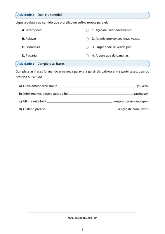 Explore o universo da formação de palavras com as Atividades de prefixo e sufixo para imprimir, um recurso didático essencial para aprimorar o vocabulário e a compreensão da estrutura da língua portuguesa. Este material foi elaborado para engajar os alunos no estudo dos elementos morfológicos, de forma prática e interativa.