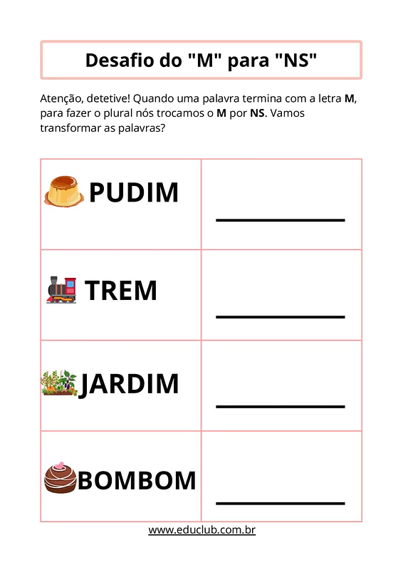 Neste material, você encontrará desafios como o "Desafio do 'M' para 'NS'", o "Labirinto do 'ÃO'", a "Máquina de Plural (R e Z)" e um "Caça-Erros Gramatical". Cada seção apresenta exercícios variados para praticar as diferentes regras de formação do plural, tornando o aprendizado dinâmico e eficaz.