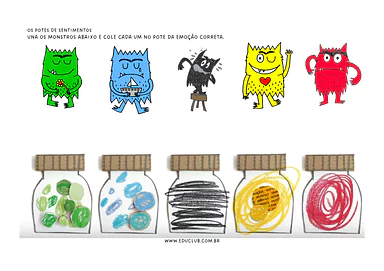 Os potes de sentimentos: A criança deve recortar os monstros e colá-los no pote de emoção correto.
