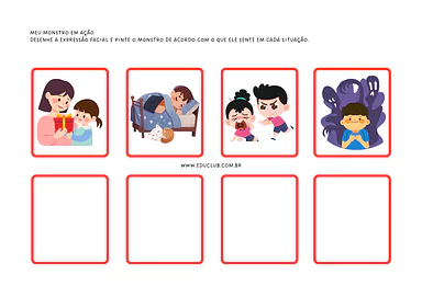 Meu monstro em ação: Esta ficha solicita que a criança desenhe a expressão facial e pinte o monstro de acordo com o que ele sente em cada situação.