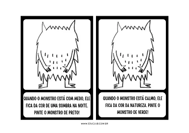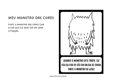 Meu Monstro das Cores: Esta atividade pede para a criança pintar o monstro com a cor que ele deve ter em cada situação. Por exemplo, o monstro fica da cor do céu em um dia de chuva quando está triste.