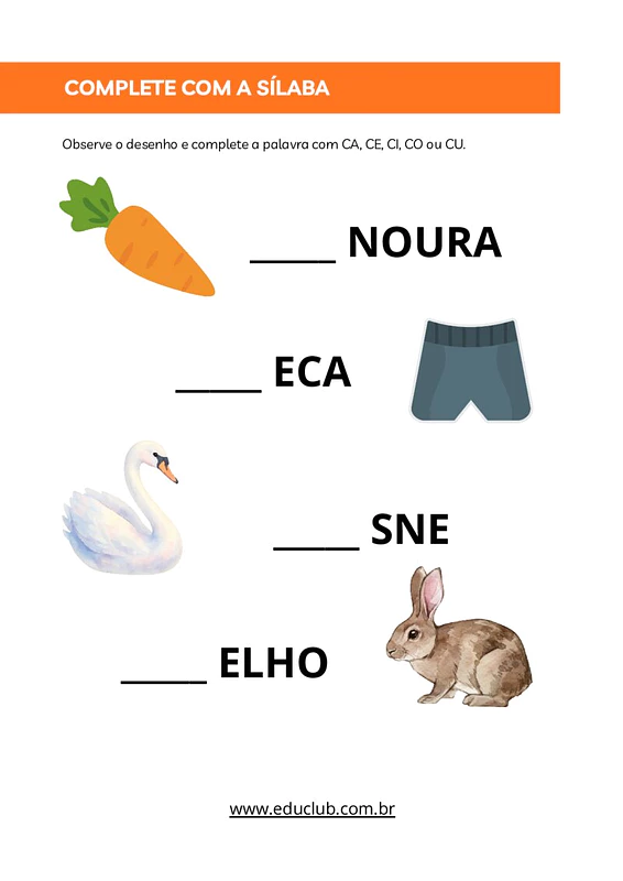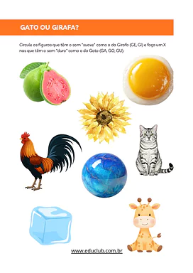 Neste exercício, você encontrará diversas atividades como a identificação de imagens que começam com os sons 'K' e 'S', exercícios de recorte e colagem para classificar palavras, completude de sílabas (CA, CE, CI, CO, CU), desenho de objetos com sílabas específicas e a distinção entre os sons 'duro' e 'suave' da letra 'G'. Há também uma atividade de 'Encontre o Intruso' para reforçar a discriminação fonológica.