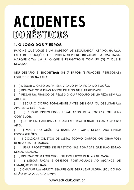 1. Inspetor de Segurança (O Jogo dos 7 Erros): Uma lista de situações cotidianas onde o aluno deve marcar "P" para Perigoso ou "S" para Seguro. O desafio é encontrar as 7 situações de risco escondidas entre comportamentos corretos, como o cabo da panela para fora do fogão ou brinquedos espalhados na escada.