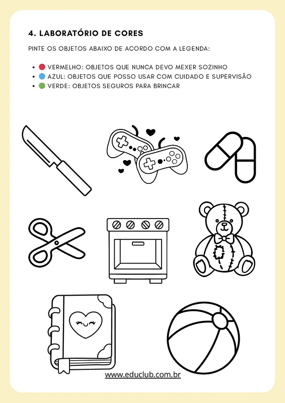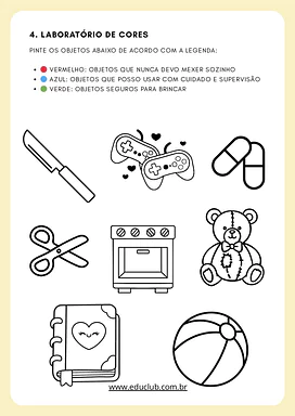 A atividade propõe uma abordagem lúdica e investigativa sobre a segurança no lar. Através do "Jogo dos 7 Erros" e de exercícios de associação de causa e efeito, as crianças aprendem a diferenciar situações seguras de perigosas. O material foca em riscos comuns, como eletricidade, queimaduras, quedas e produtos químicos, incentivando a criança a ser uma agente ativa na prevenção de acidentes e a saber exatamente a quem recorrer em caso de emergência.