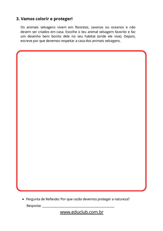 - Colorir e Proteger: Uma seção dedicada à empatia animal, onde o aluno desenha seu animal selvagem favorito em seu habitat natural e responde a perguntas de reflexão sobre por que devemos respeitar a "casa" dos animais e proteger a natureza.